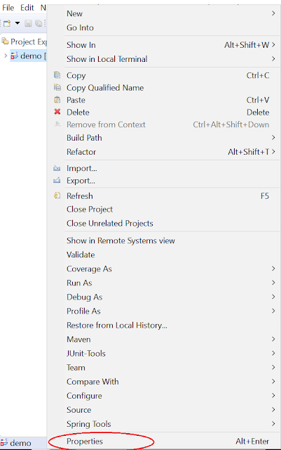 To fix this, right-click on the project name. In the below screenshot, my project’s name is demo. A list of options will be displayed. Click the last option in the list, Properties.